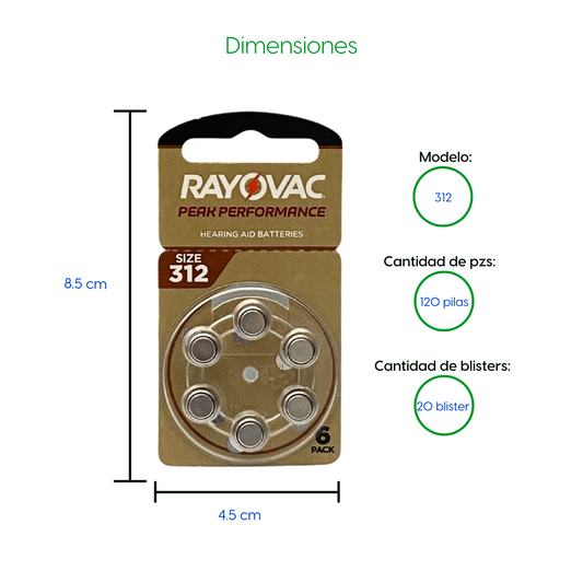 Bateria 6 Pilas Auditivas Tamaño 312 Rayovac Peak Performance 1 BlisterPrecio habitual $ 73.00 MXNPrecio habitualPrecio unitario / por-