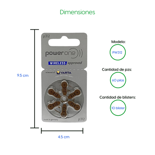 Pila 312 Power One para Auxiliar Auditivo 60 pilas 10 blisters